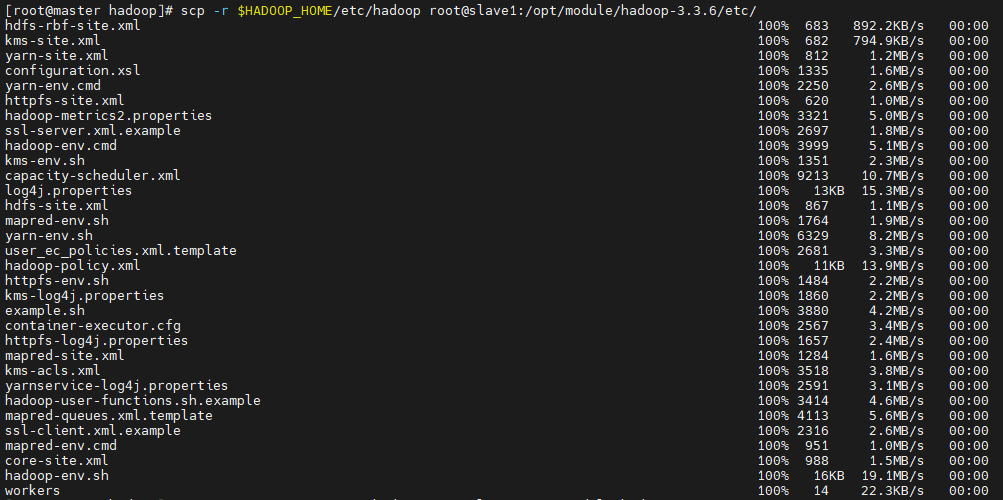 1 | scp -r $HADOOP_HOME/etc/hadoop root@slave1:/opt/module/hadoop-3.3.6/etc/ |