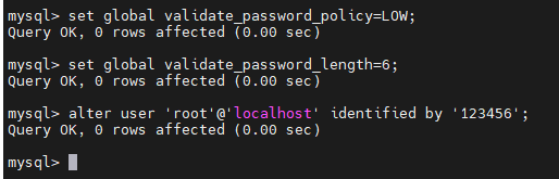 # 修改密码 # 设置密码的验证强度等级 set global validate_passsword_policy=LOW; # 设置为6位的密码 set global validate_password_length=6; # 设置密码 alter user 'root'@'localhost' identified by '123456';