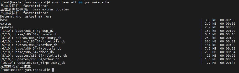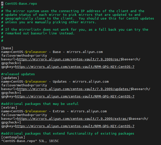 # 添加以下内容 # CentOS-Base.repo # # The mirror system uses the connecting IP address of the client and the # update status of each mirror to pick mirrors that are updated to and # geographically close to the client. You should use this for CentOS updates # unless you are manually picking other mirrors. # # If the mirrorlist= does not work for you, as a fall back you can try the # remarked out baseurl= line instead. # # [base] name=CentOS-$releasever - Base - mirrors.aliyun.com failovermethod=priority baseurl=https://mirrors.aliyun.com/centos-vault/7.9.2009/os/$basearch/ gpgcheck=1 gpgkey=https://mirrors.aliyun.com/centos-vault/RPM-GPG-KEY-CentOS-7 #released updates [updates] name=CentOS-$releasever - Updates - mirrors.aliyun.com failovermethod=priority baseurl=https://mirrors.aliyun.com/centos-vault/7.9.2009/updates/$basearch/ gpgcheck=1 gpgkey=https://mirrors.aliyun.com/centos-vault/RPM-GPG-KEY-CentOS-7 #additional packages that may be useful [extras] name=CentOS-$releasever - Extras - mirrors.aliyun.com failovermethod=priority baseurl=https://mirrors.aliyun.com/centos-vault/7.9.2009/extras/$basearch/ gpgcheck=1 gpgkey=https://mirrors.aliyun.com/centos-vault/RPM-GPG-KEY-CentOS-7 #additional packages that extend functionality of existing packages [centosplus] name=CentOS-$releasever - Plus - mirrors.aliyun.com failovermethod=priority baseurl=https://mirrors.aliyun.com/centos-vault/7.9.2009/centosplus/$basearch/ gpgcheck=1 enabled=0 gpgkey=https://mirrors.aliyun.com/centos-vault/RPM-GPG-KEY-CentOS-7 #contrib - packages by Centos Users [contrib] name=CentOS-$releasever - Contrib - mirrors.aliyun.com failovermethod=priority baseurl=https://mirrors.aliyun.com/centos-vault/7.9.2009/contrib/$basearch/ gpgcheck=1 enabled=0 gpgkey=https://mirrors.aliyun.com/centos-vault/RPM-GPG-KEY-CentOS-7
